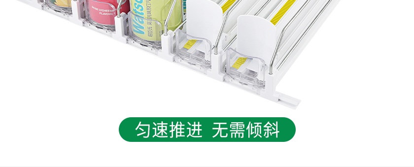 顧名思義就是常規(guī)飲料推進(jìn)器上面加裝阻尼減速裝置,并搭配齒輪,齒條而成的一種可以自動(dòng)緩慢勻速推進(jìn)的貨架推進(jìn)器。