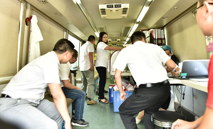 無償獻血現(xiàn)場 “無償獻血是好事啊,不僅能保障醫(yī)療臨床用血、治病救人的需要,也是一種無私奉獻、救死扶傷的崇高行為,而且獻血對自己身體也有好處”。這是在獻血車上購樂得推煙器公司員工陳艷偉說的話,陳艷偉是購樂得公司的老員工了,今年38歲,早上上班時無意中聽到同事們在討論無償獻血的活動,今天下午手頭工作一忙完就趕來獻血。