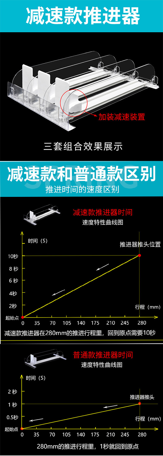 今天我們來說說,減速推進器跟常規(guī)推進器的區(qū)別。減速款推進器是指在普通款推進器結構基礎上,加裝減速裝置,使推進器在推進過程中勻速推進,同時也避免了普通款推進器因推進速度過快導致彈壓商品等問題,減速款推進器的推進速度比普通型貨架推進器的速度慢10分之一,并且推進過程中更加穩(wěn)定和安全,其理論依據(jù)為線速度=周長(2πr)*轉(zhuǎn)速(n),周長恒定轉(zhuǎn)速為10分之一,那么減速款推進器的線速度約為普通型推進器速度的10分之一。并且推進動力發(fā)條力度可按要求定做,目前主要應用在大型商場專柜上。