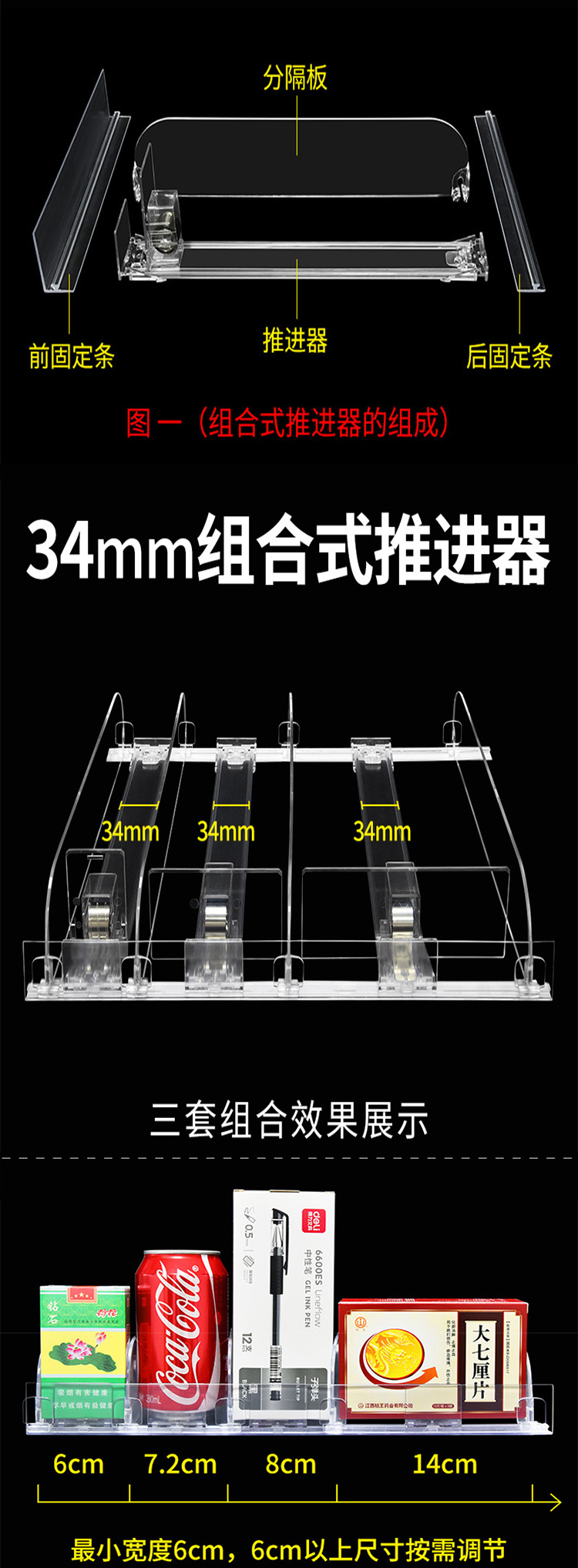 組合式推進(jìn)器由前后固定條、推進(jìn)器、分隔板組合而成,使用時(shí)需要前后固定條上的膠紙固定在層板上,因分隔板能調(diào)節(jié)寬度而廣泛應(yīng)用,購(gòu)樂(lè)得組合式推進(jìn)器也區(qū)分幾個(gè)不同寬度導(dǎo)軌,分別有14mm,18mm,25mm,34mm,不同寬導(dǎo)軌可適合推不同寬度的產(chǎn)品。