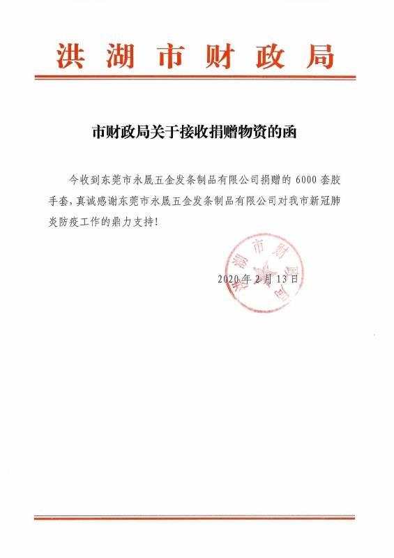 疫情來勢洶洶,可能全國人民都是猝不及防,目前,新冠肺炎依然處在肆虐期間,各類相關(guān)抗疫物質(zhì),小到手套、口罩、護目鏡、消毒液,大到醫(yī)療器械、防護服等物質(zhì)都非常緊缺,在這個關(guān)鍵檔口,社會各界紛紛在想方設(shè)法籌集各種有用物質(zhì)支援疫區(qū),為打贏疫情攻堅戰(zhàn)而努力。購樂得所屬的東莞市永晟五金發(fā)條制品有限公司多年以后一直熱衷于公益事業(yè),在此緊要時期自然不會袖手旁觀,經(jīng)過多方聯(lián)系溝通,永晟終于成功將一批套膠手套送往了湖北省洪湖市財政局,請他們代為分配。 “天下興亡 匹夫有責(zé)”,就目前的形勢來看,疫情可能還會再持續(xù)一段時間,特別是湖北武漢地區(qū),從疫區(qū)的情況來看,這批物質(zhì)也只是杯水車薪,不過好在情況在慢慢的好轉(zhuǎn),永晟依然會持續(xù)關(guān)注疫情的發(fā)展,想方設(shè)法的為疫區(qū)提供幫助,直到戰(zhàn)疫勝利。最后在這里衷心的祝愿全國人民都能夠平安無事,希望疫情早日結(jié)束、大家的生活工作早日恢復(fù)正常、國泰民安!