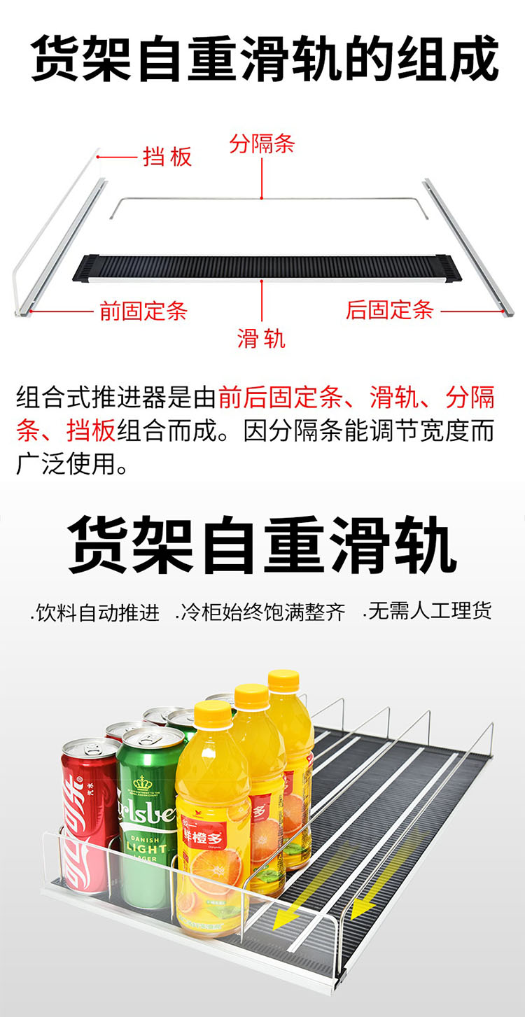 貨架自動(dòng)滑軌是指把滑軌、前后固定條、擋板和分隔條組裝在一起的貨架展示架,在3-5°傾斜角度下,商品利用之身重力自動(dòng)滑向前端,實(shí)現(xiàn)自動(dòng)理貨的功能。當(dāng)客人取走擺放在貨架自重滑道上面的第一個(gè)商品后,根據(jù)重力的原理后面的商品會(huì)自動(dòng)的往前滑,始終讓商品展示在第一位,大大提升了商品的展示能力,不需要專門組織人工去整理貨物,節(jié)省人工和成本。