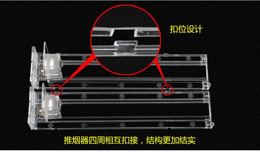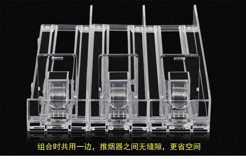 當(dāng)客人取走擺放在一體式推煙器上面的第一個(gè)商品后,后面的商品會(huì)自動(dòng)的往前推,始終讓商品展示在第一位,大大提升了商品的展示能力,不需要專門組織人工去整理貨物,節(jié)省人工和成本。