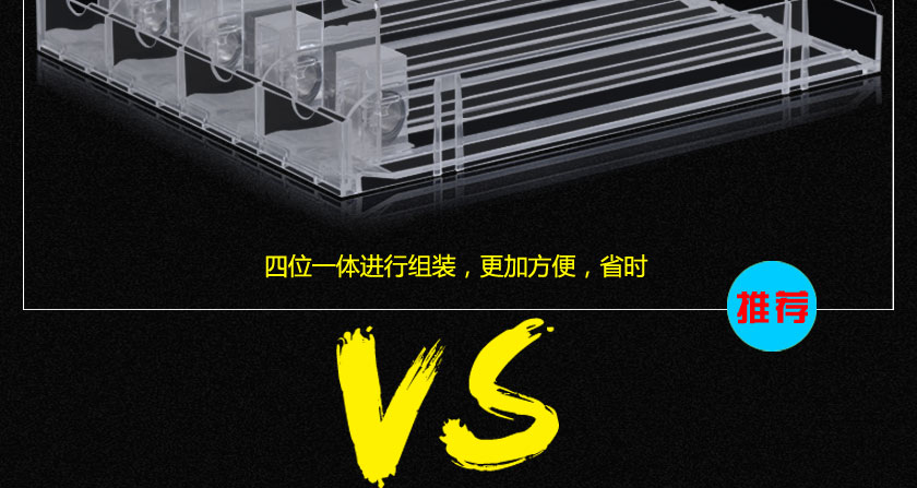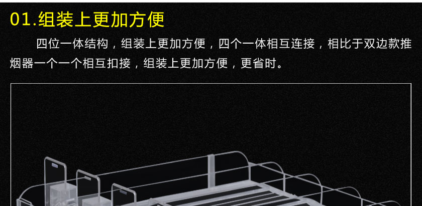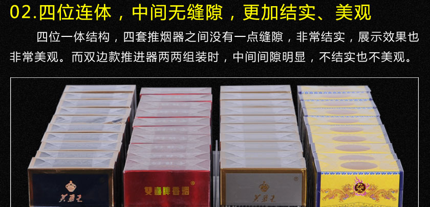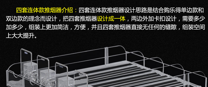 四連款推煙器是指在一體式雙邊款推進器的結構基礎上,把四個推進器設計成一個整體的自動推進貨架,由于它的寬度適用于香煙,所以也稱為香煙推進器,相比于一體式雙邊款推進器,四連體款在組裝上更加簡單和方便,而且具有更好的穩(wěn)定性和牢固性。