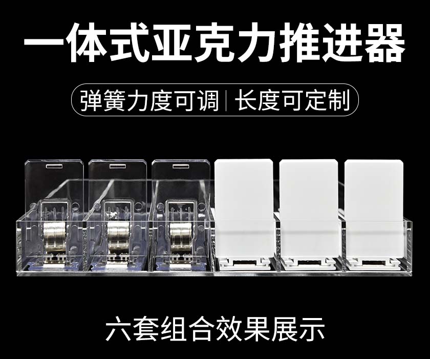 一體式亞克力推進(jìn)器是指推進(jìn)器搭配亞克力盒架組裝而成的一體式自動推進(jìn)貨架,因推進(jìn)器彈簧和推進(jìn)器長度可按要求定制,因此廣泛應(yīng)用在化妝品,香煙,食品,文具,藥品上。
