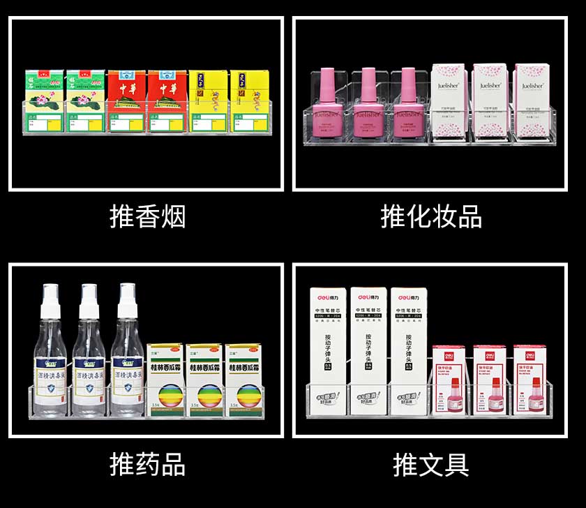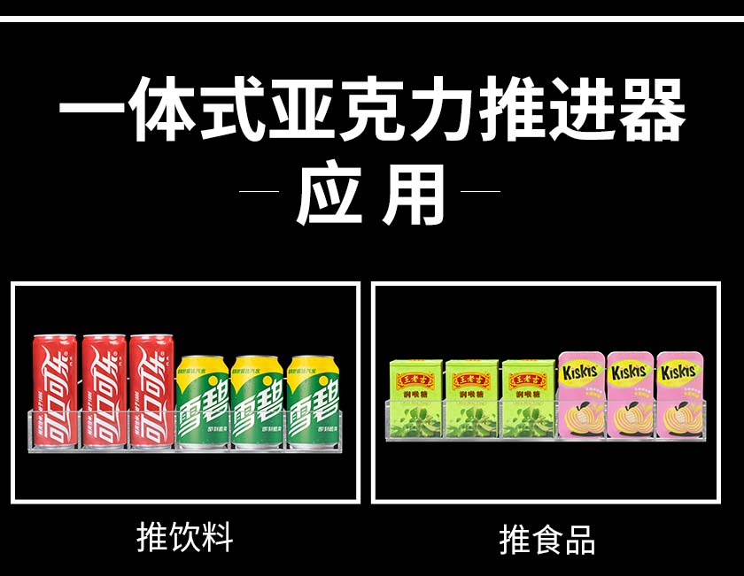 當(dāng)客人取走擺放在一體式推進(jìn)器上面的第一個商品后,后面的商品會自動的往前推,始終讓商品展示在第一位,大大提升了商品的展示能力,不需要專門組織人工去整理貨物,節(jié)省人工和成本。