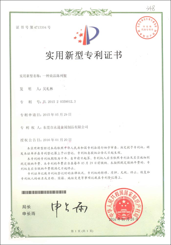 商品陳列架專利證書(shū)